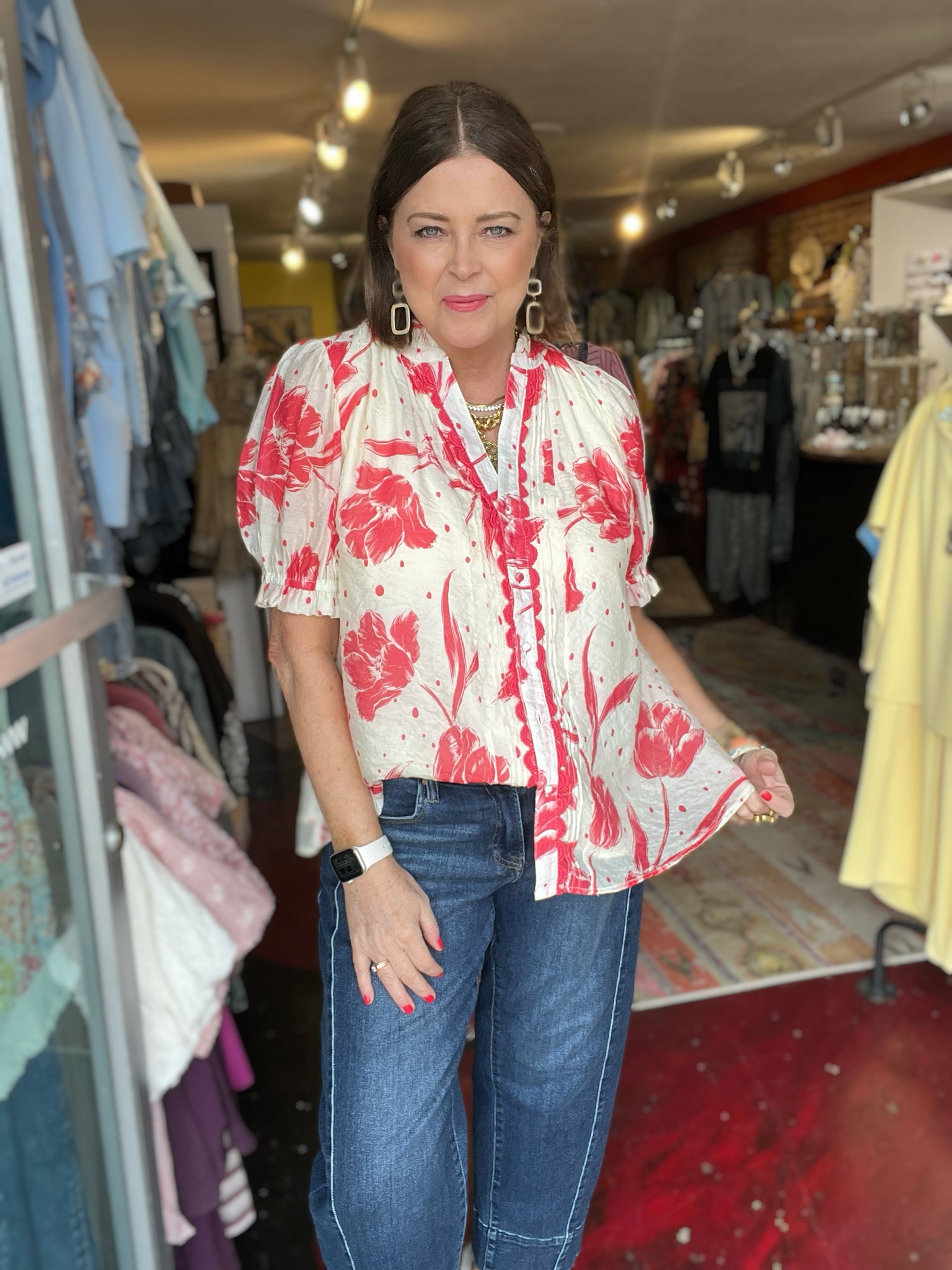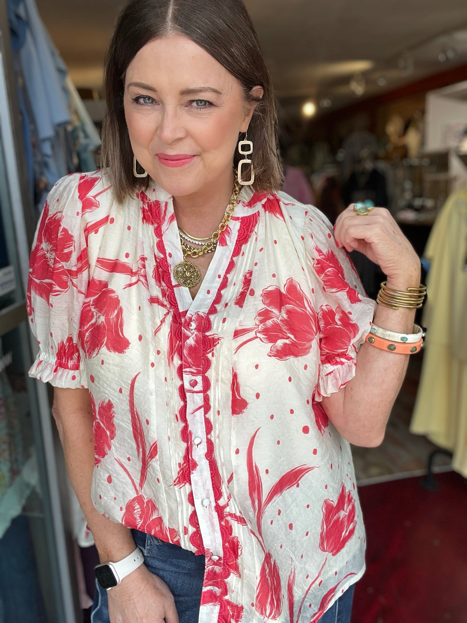 • Kelli is wearing a medium and it is generous. She could size down.