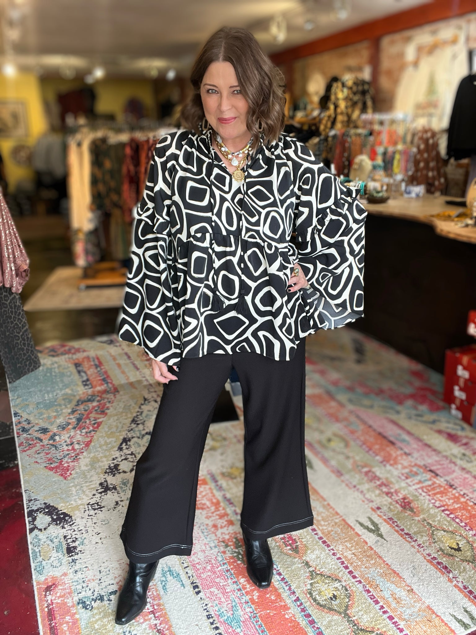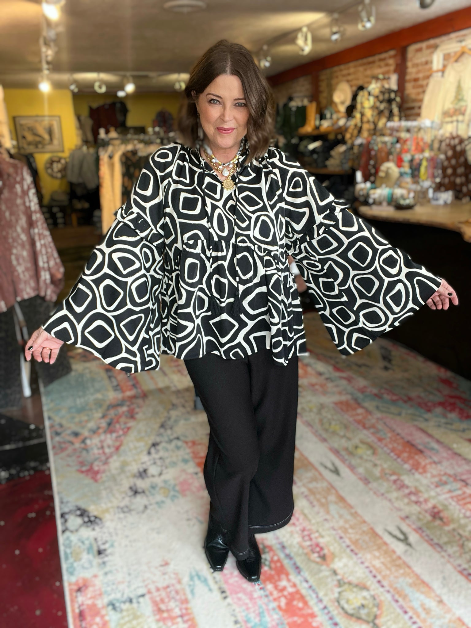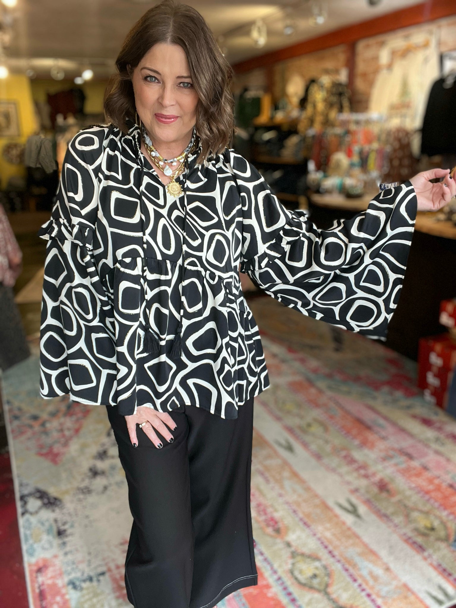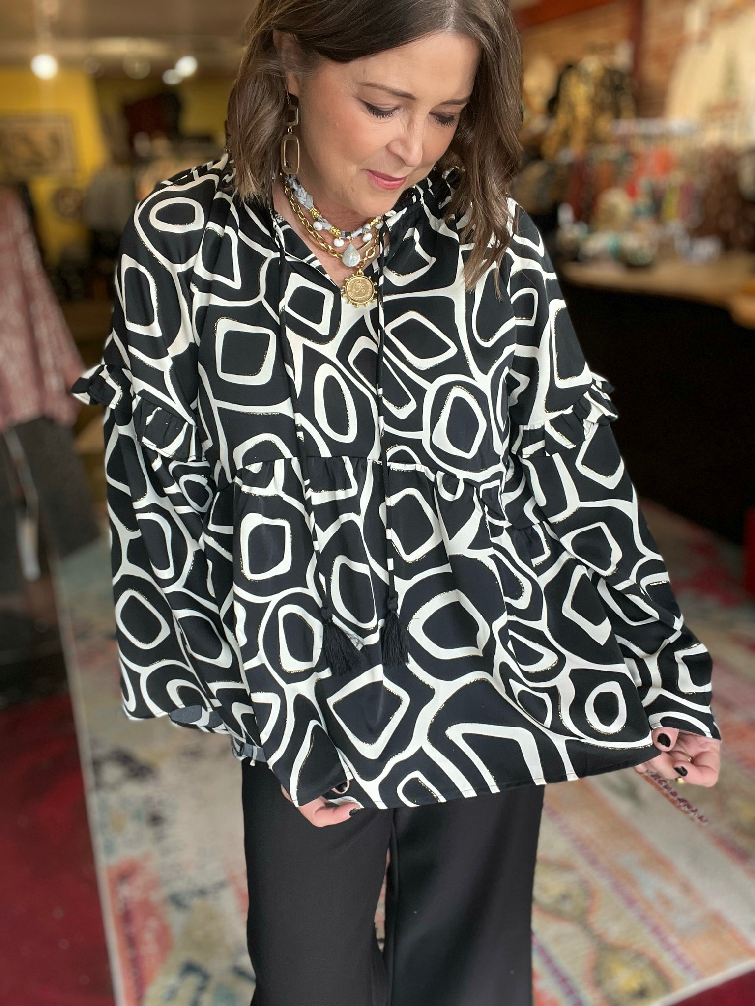 • bell sleeve black, white and gold top