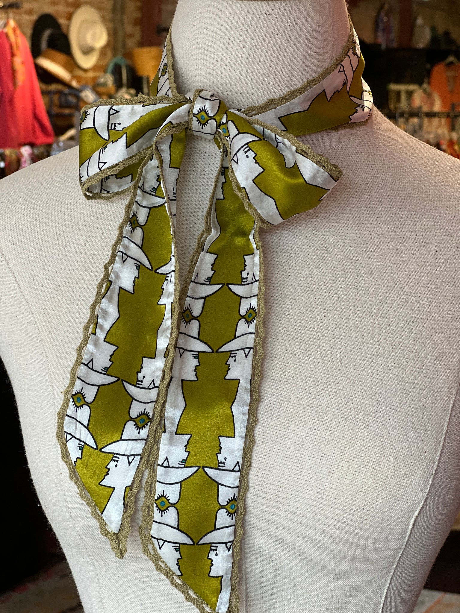 Mod Maud features a vivid vintage green mod cowboy print with turquoise accents and matching green crochet trim.