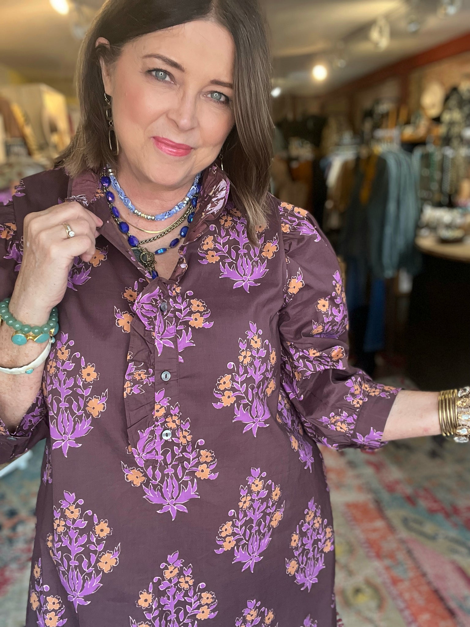 A romantic mix of western charm and vintage floral beauty, the Plum Prairie Dress features a rich brown base adorned with plum lilac blossoms. Its flowy silhouette and button-front design make it effortlessly elegant for any season.
