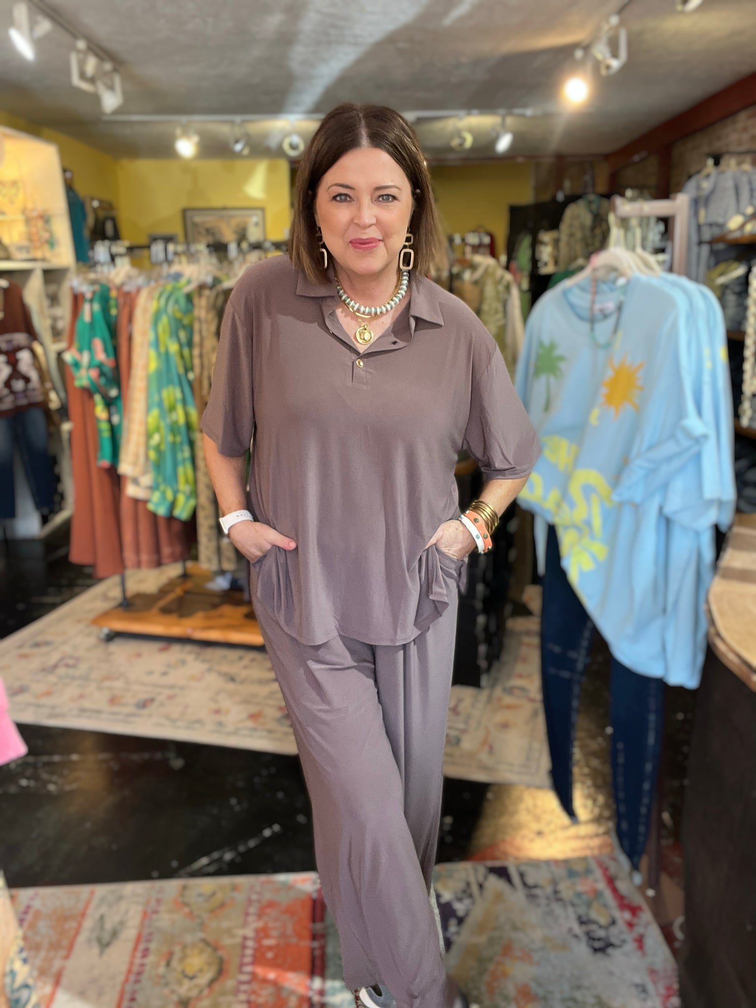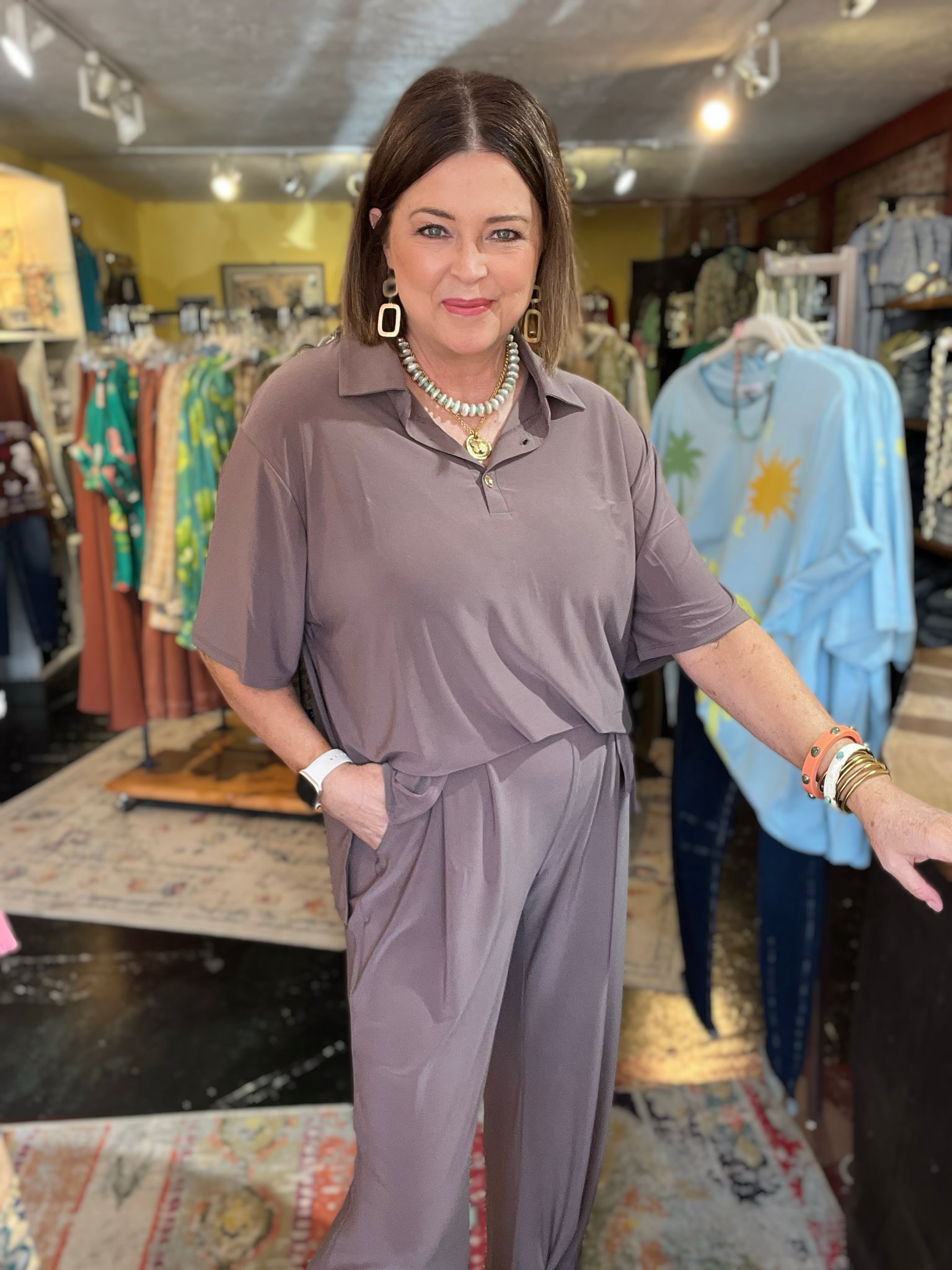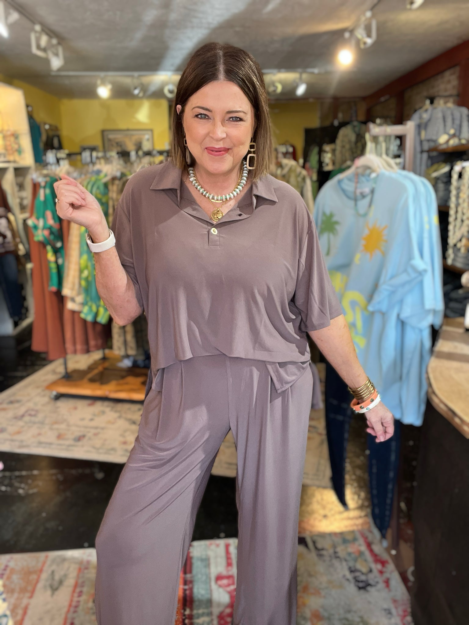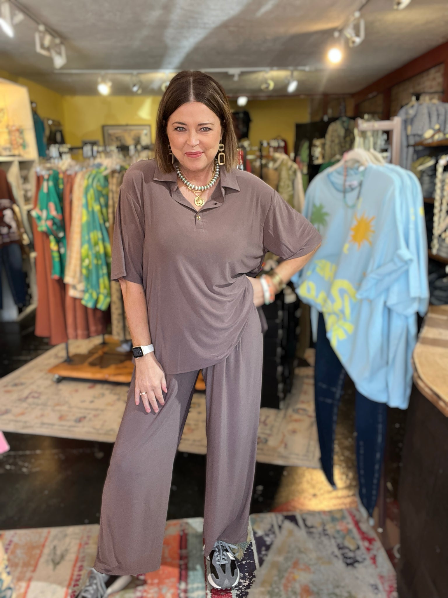 • top is tshirt tunic style with 2 gold buttons